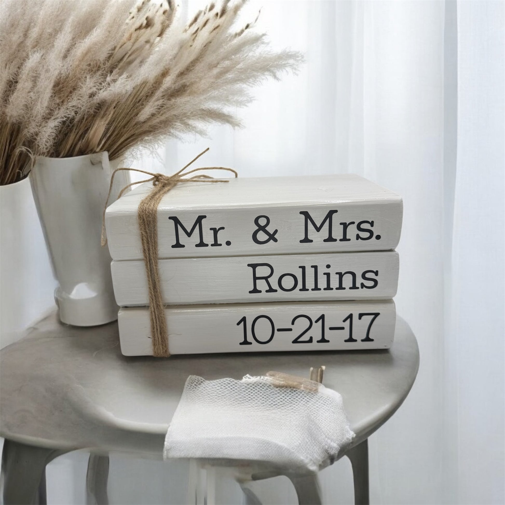 Elevate your wedding decor with our exquisite Wooden Book Stack, featuring three elegantly crafted white books adorned with the timeless words "Mr. and Mrs." This charming piece not only adds a touch of sophistication to your celebration but also serves as a beautiful keepsake for years to come. Perfect for display on your reception table or as a thoughtful gift for newlyweds, this book stack embodies love and unity, making it an essential addition to any wedding-themed setting.